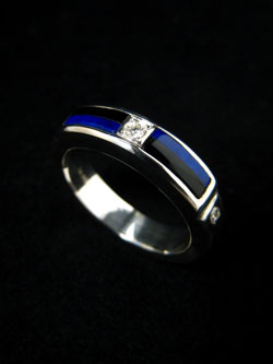 婚約指輪として制作したリングです。オニキスとラピスを使用し、真ん中と両サイドにダイヤモンドを入れました。