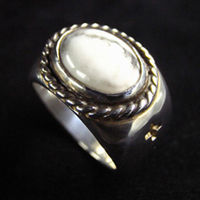 ターコイズを横向きにセットし、周りにはねじれ線を付け、サイドには十字の刻印が打ってあるリングです。
